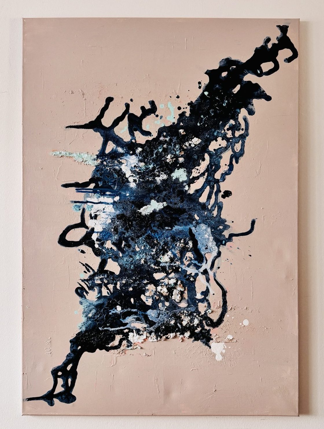 Dieses abstrakte Gemälde verbindet kraftvolle, dynamische Bewegungen mit ruhigen, offenen Flächen. Dunkelblaue, weiße und blaue Farbschichten treffen in spontanen Gesten aufeinander und erzeugen eine lebendige Spannung, die den Blick immer wieder neu anzieht. Das Werk entstand in einer intuitiven, prozessorientierten Malweise und wurde im unteren Bereich überarbeitet, um Tiefe und Klarheit zu verstärken.
