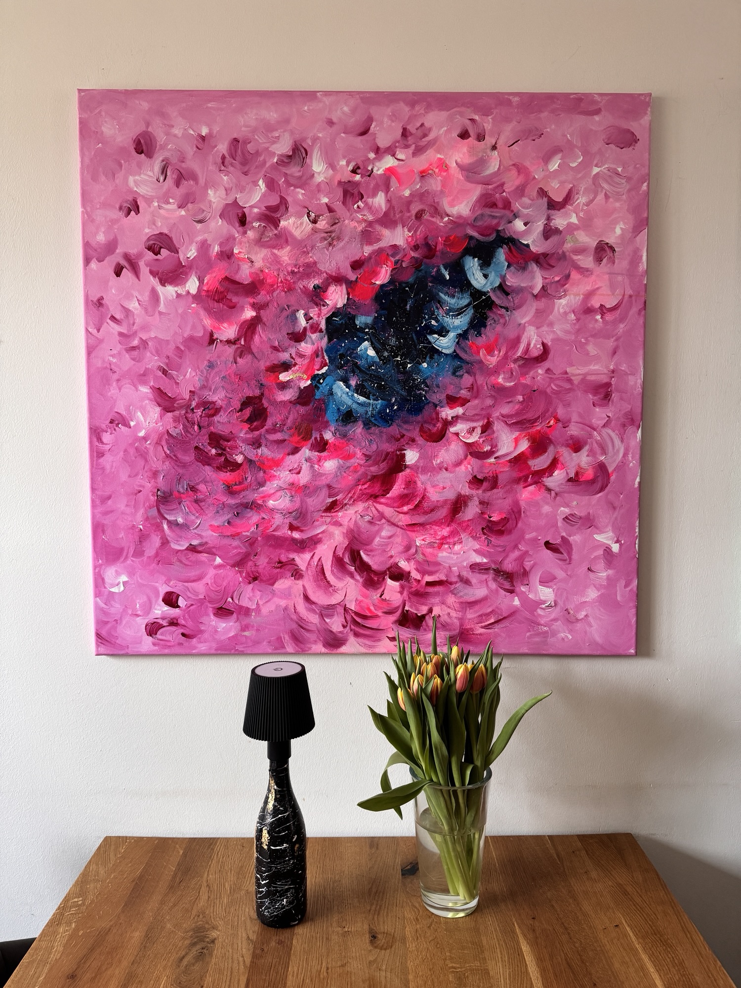 Dieses abstrakte Gemälde verbindet Leichtigkeit und Tiefe: Zarte Rosa- und Pinktöne entfalten sich wie eine bewegte Blütenlandschaft, während im Zentrum ein intensiver, dunkelblauer Kern entsteht. Die kraftvollen Pinselstriche und feinen Farbspritzer erzeugen eine spannende Dynamik zwischen Oberfläche und verborgener Struktur. Das Werk wirkt zugleich lebendig und ruhig und setzt einen starken, modernen Akzent in jedem Raum.