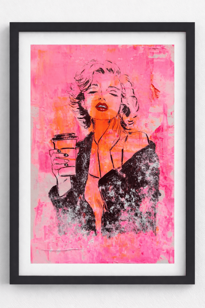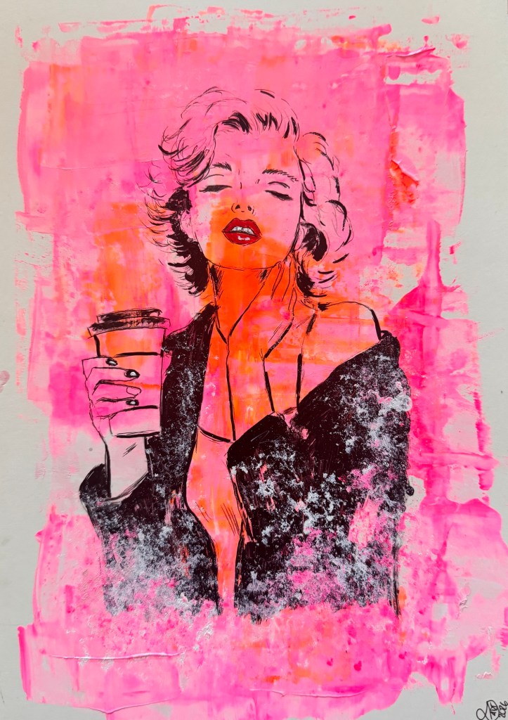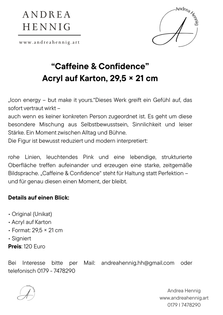 Weitere Informationen zu „Caffeine & Confidence“ – Modernes Acrylgemälde auf Karton, 29,5 x 21 cm