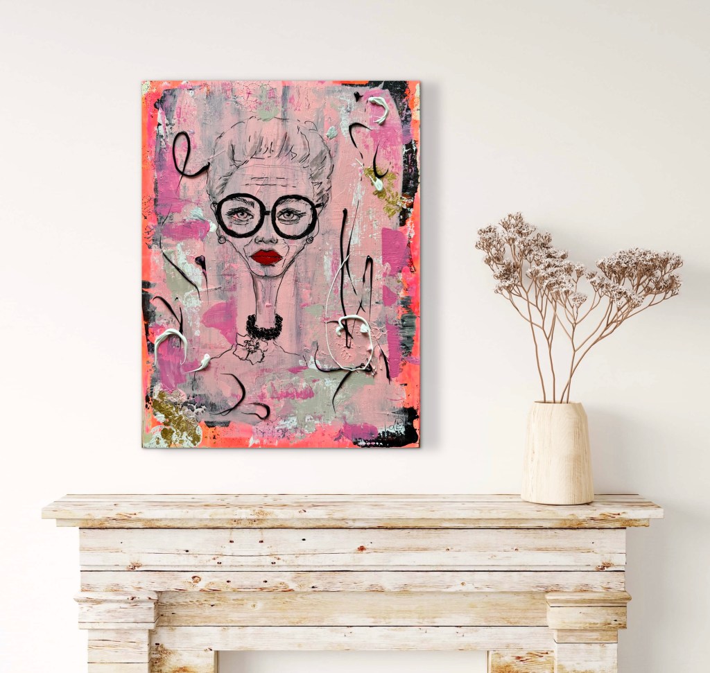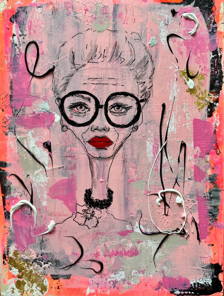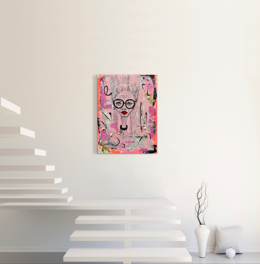 Dieses Werk ist eine Hommage an eine der faszinierendsten Stil-Ikonen unserer Zeit: Iris Apfel. Eine Frau, die gezeigt hat, dass Individualität keine Altersgrenze kennt und dass Stil vor allem eines ist – Haltung.