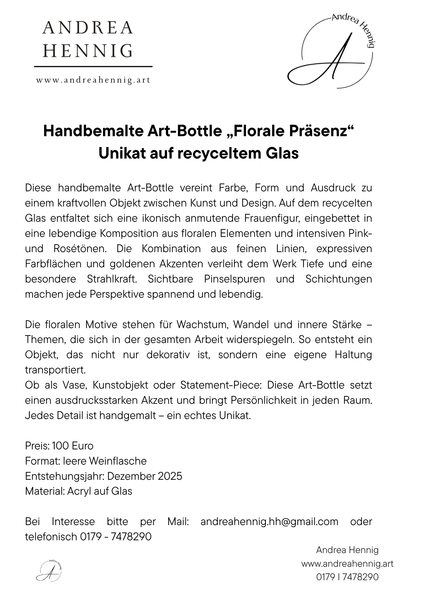 Handbemalte Art-Bottle „Florale Präsenz“ Unikat auf recyceltem Glas