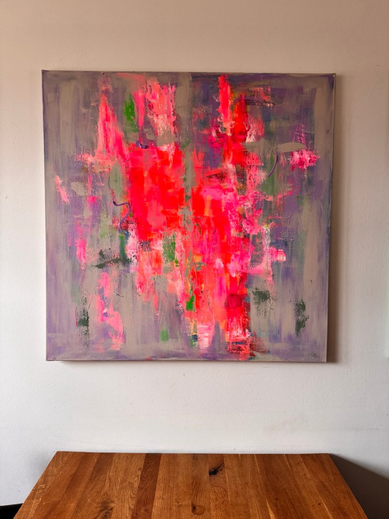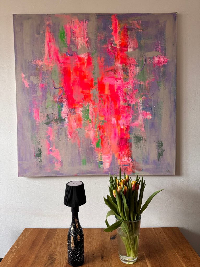 Dieses großformatige Gemälde entfaltet besonders in modernen, reduzierten Räumen seine Wirkung. Es ist ein Statement-Piece, das nicht laut sein muss, um präsent zu sein – sondern durch seine innere Bewegung und Farbintensität eine Atmosphäre schafft, die gleichzeitig kraftvoll und ruhig wirkt.