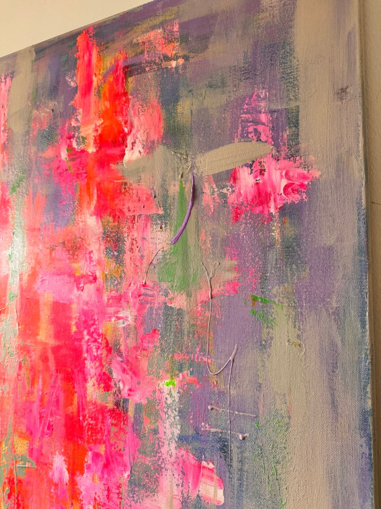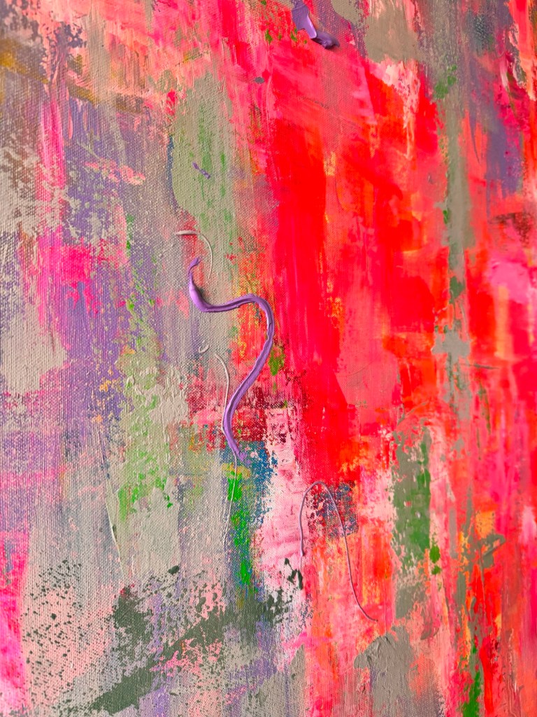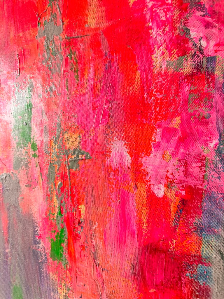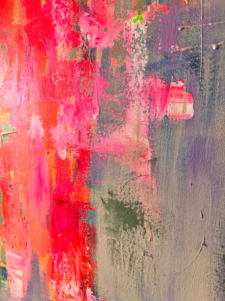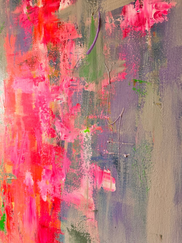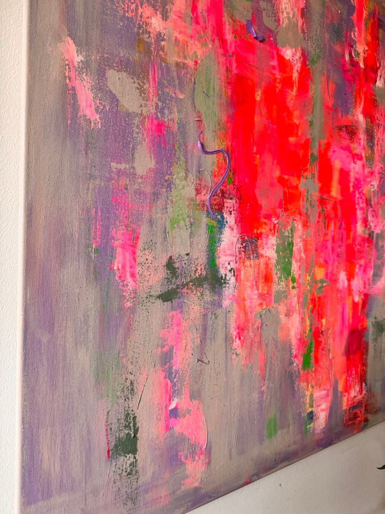 „Zwischen Impuls und Stille“ ist ein Werk, das Gegensätze nicht auflöst, sondern bewusst nebeneinander bestehen lässt. Leuchtende Neon-Pink- und Rottöne brechen durch eine ruhige, fast nebelhafte Fläche aus Grau-, Beige- und zarten Violettnuancen – wie ein innerer Impuls, der sich seinen Weg an die Oberfläche bahnt.