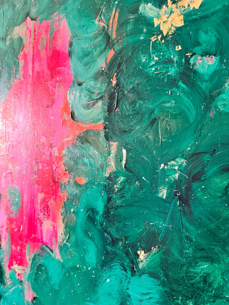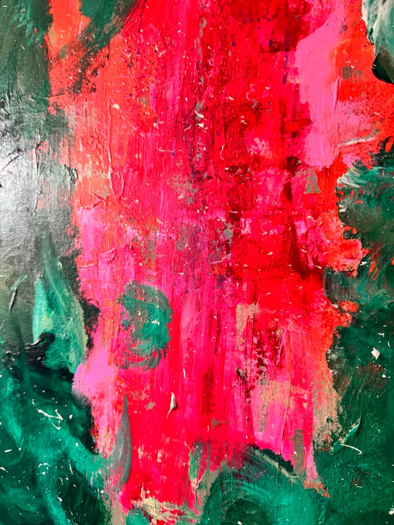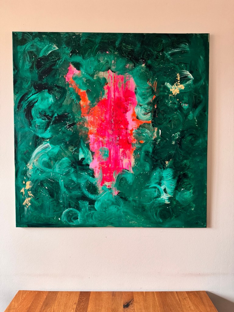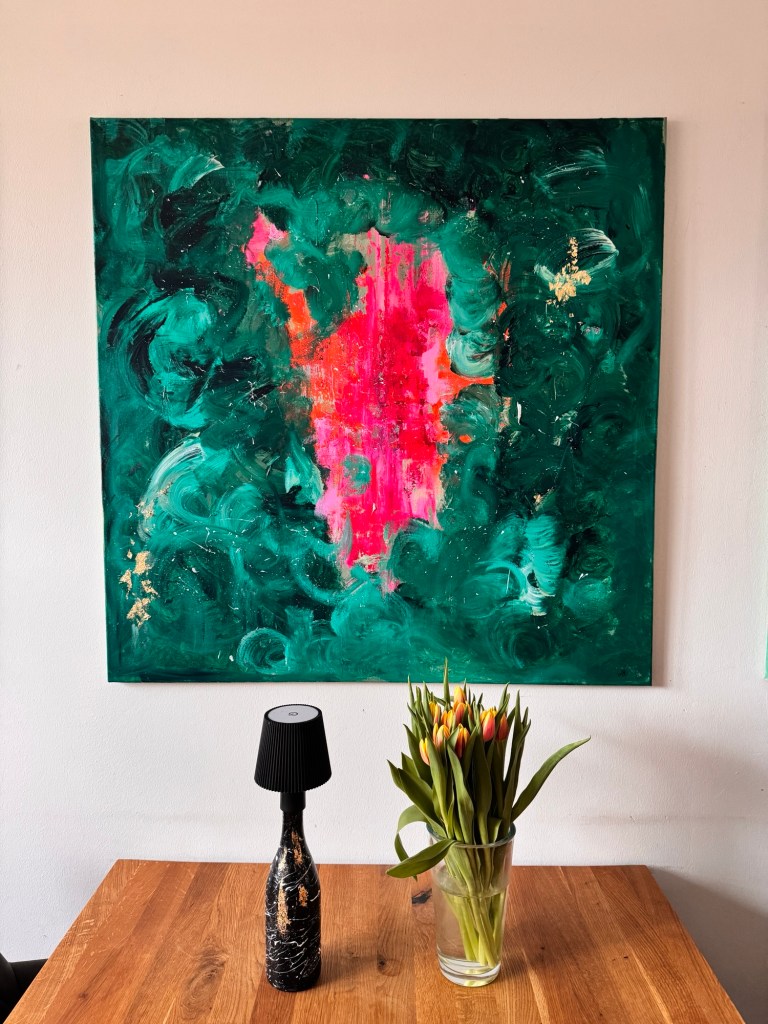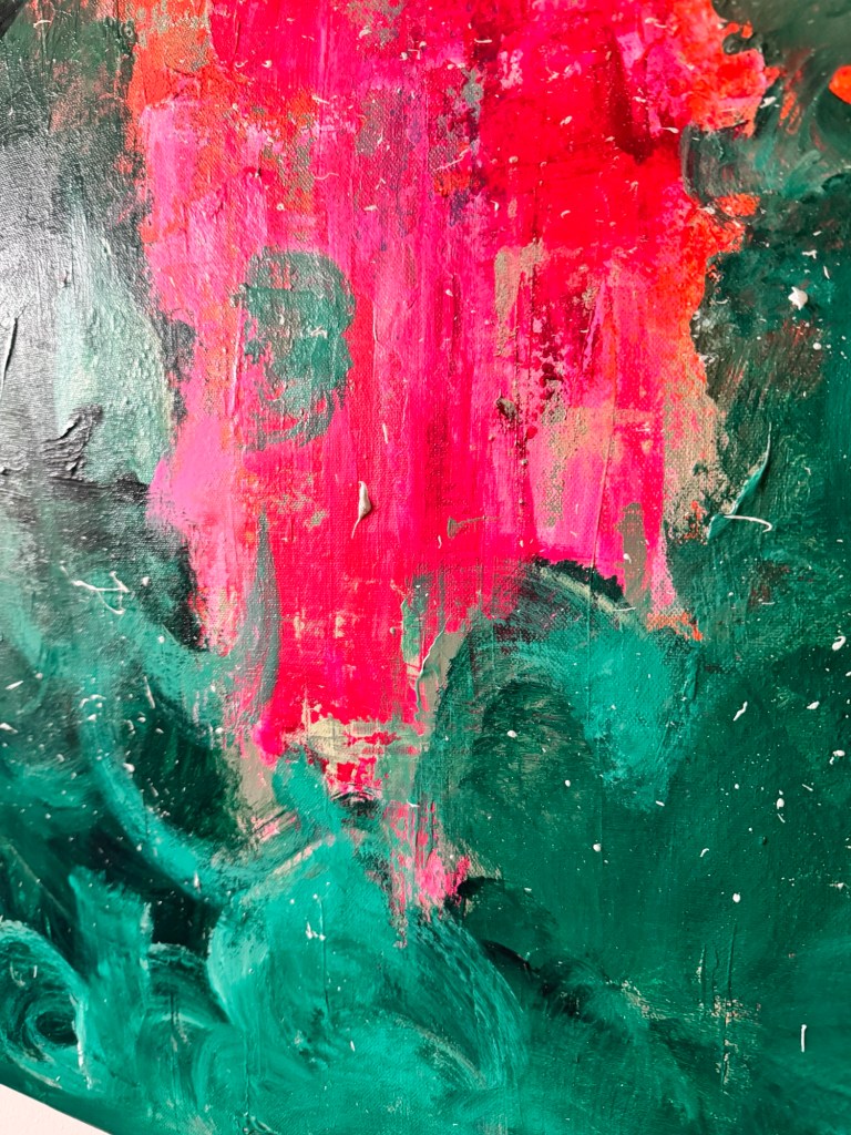 Im Zentrum entsteht eine Spannung zwischen Kontrolle und Loslassen. Das Pink wirkt wie ein innerer Impuls – ein Puls, der sich durch die ruhiger wirkenden, dunkleren Grüntöne hindurchdrückt. Genau darin liegt die Kraft dieses Werkes: in der Balance zwischen Energie und Tiefe.