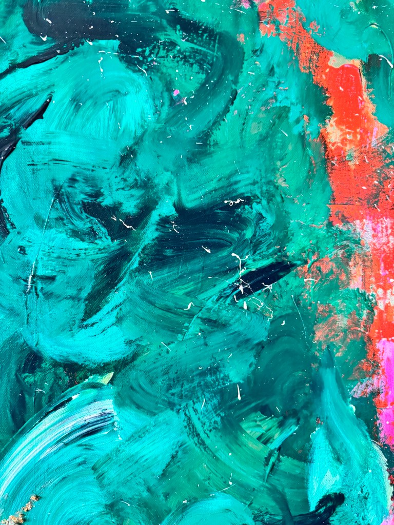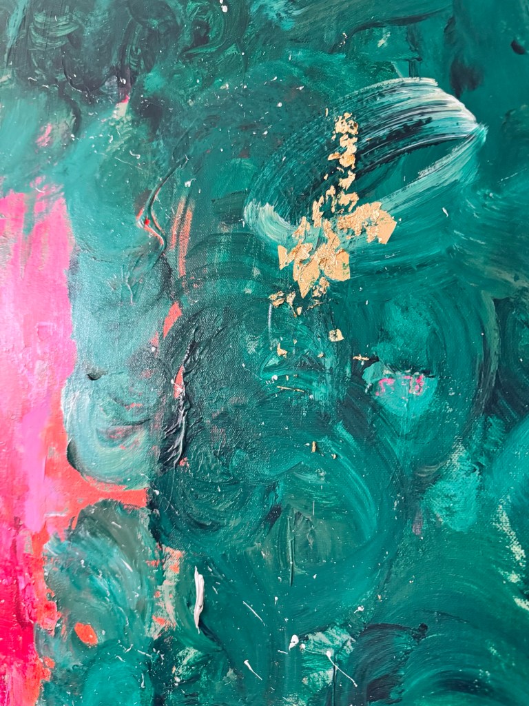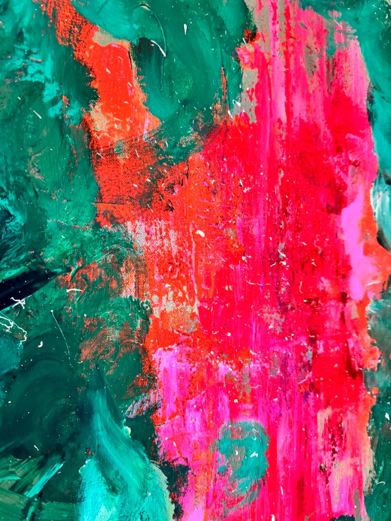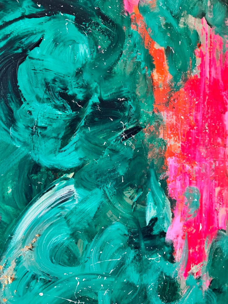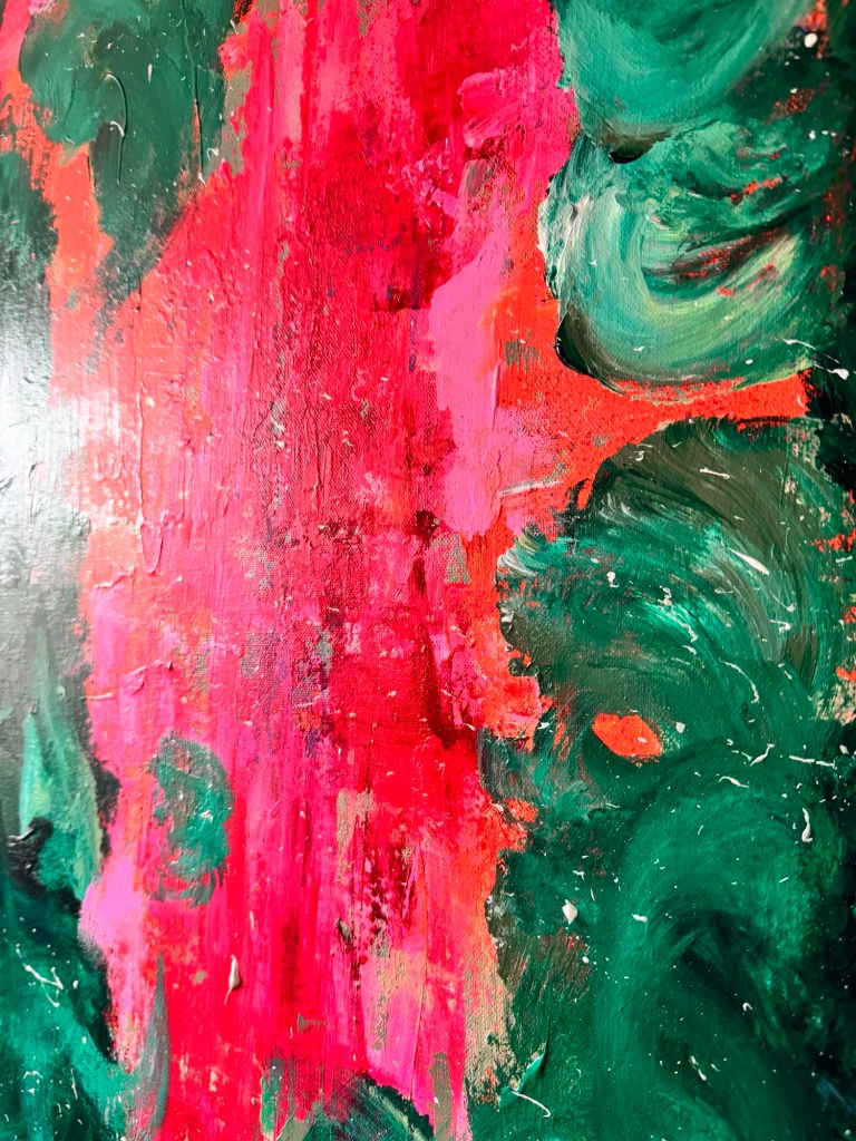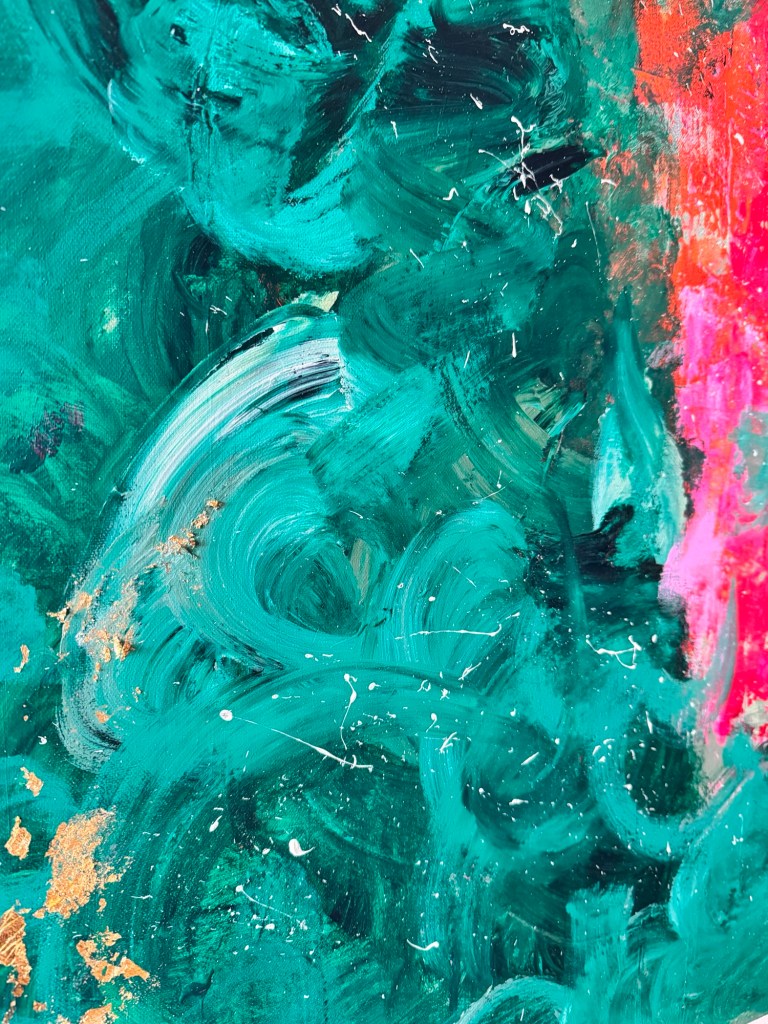 Im Zentrum entsteht eine Spannung zwischen Kontrolle und Loslassen. Das Pink wirkt wie ein innerer Impuls – ein Puls, der sich durch die ruhiger wirkenden, dunkleren Grüntöne hindurchdrückt. Genau darin liegt die Kraft dieses Werkes: in der Balance zwischen Energie und Tiefe.