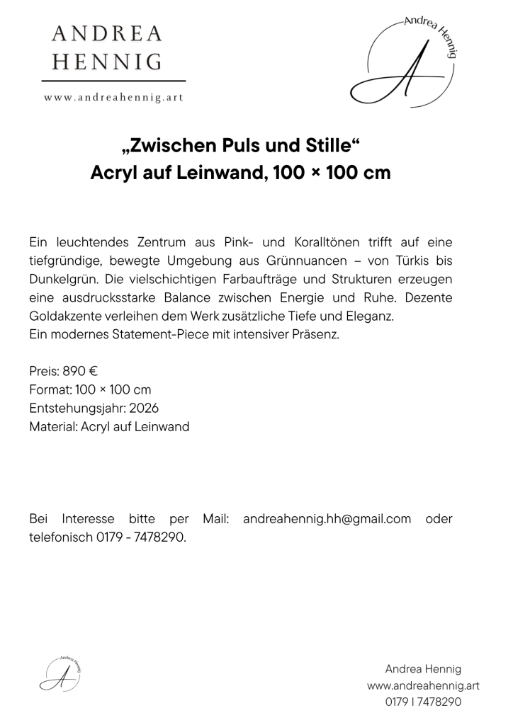 „Zwischen Puls und Stille“ ist ein großformatiges Statement-Piece, das Räume nicht nur ergänzt, sondern prägt. Es zieht den Blick an und entfaltet seine Wirkung mit jeder neuen Betrachtung.